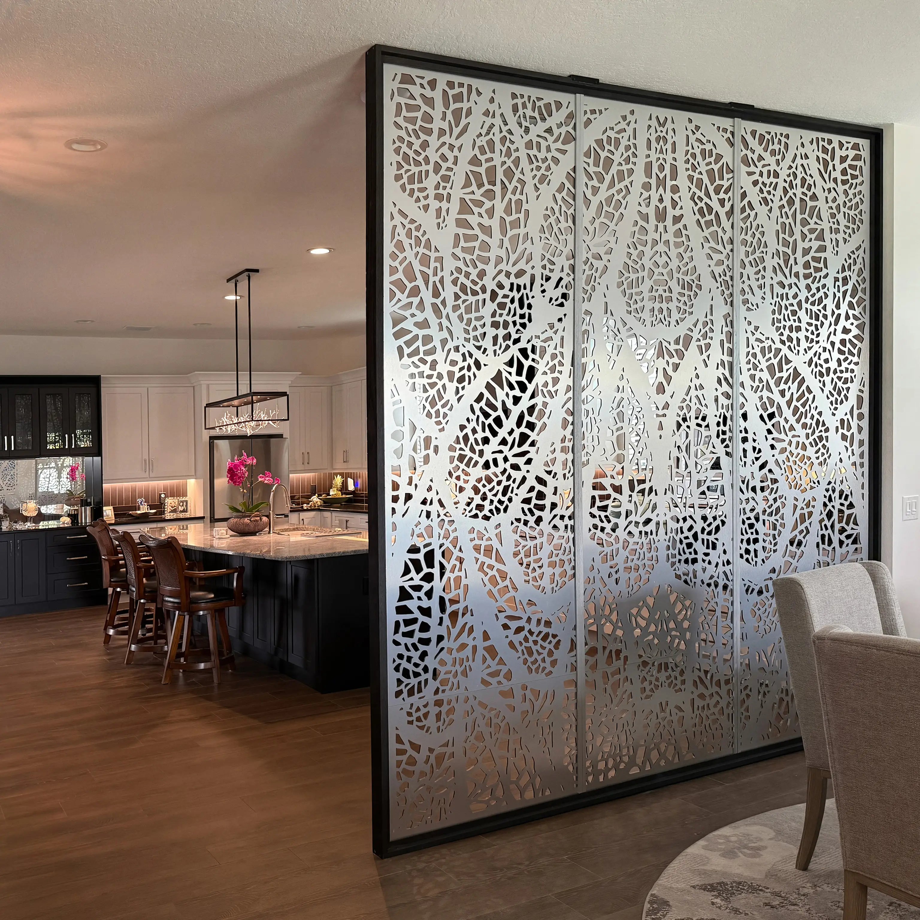 Select from 160+ indoor privacy screen patterns ranging from geometric lattices and modern linework dividers to organic leaf cutouts and parametric wall art panels. Each design is crafted for interiors where both aesthetics and light play matter.
