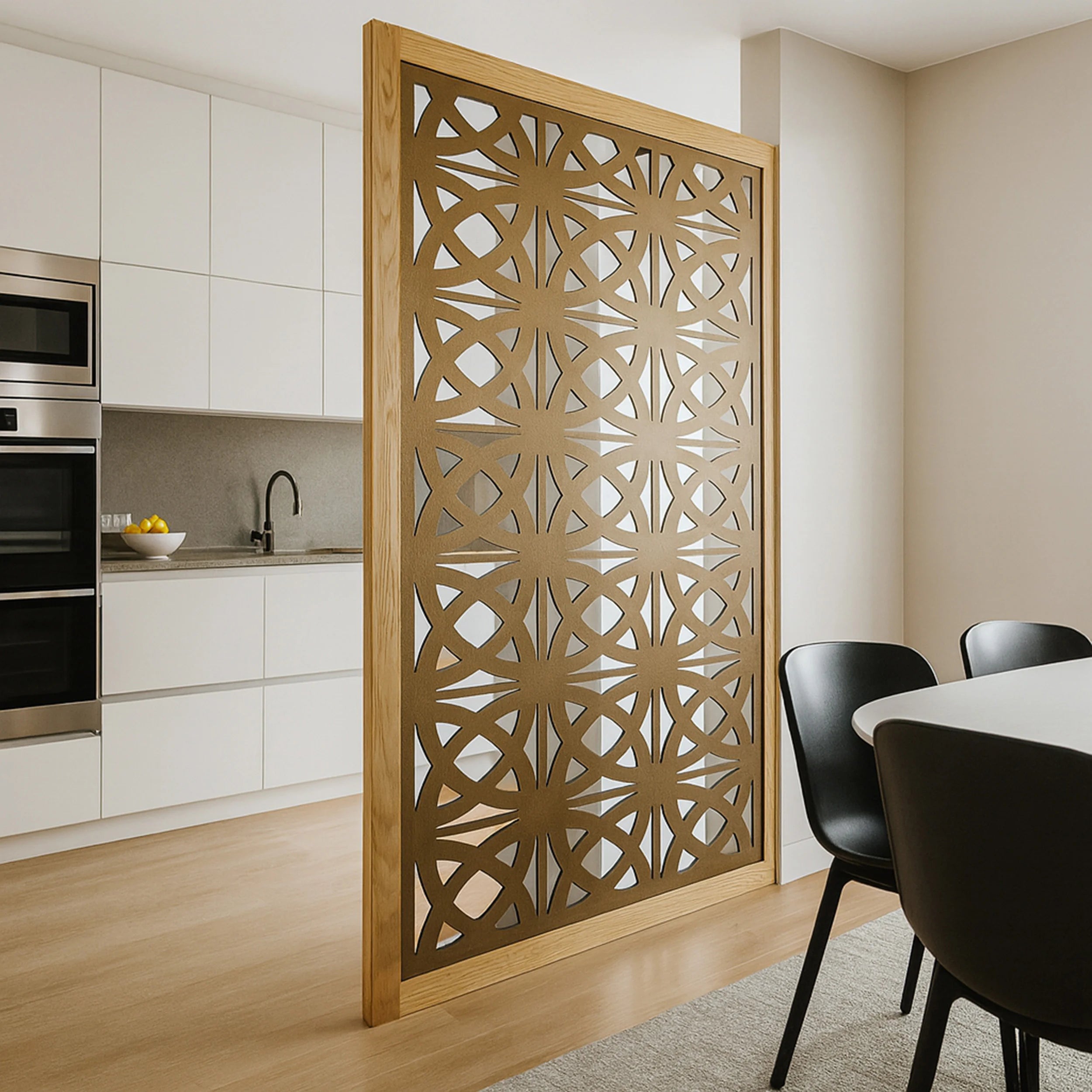 Enhance interiors with indoor privacy panels designed to define spaces beautifully. Perfect for home offices, living rooms, studio partitions, or loft dividers, these CNC-cut screens create separation while allowing airflow and light to pass through.