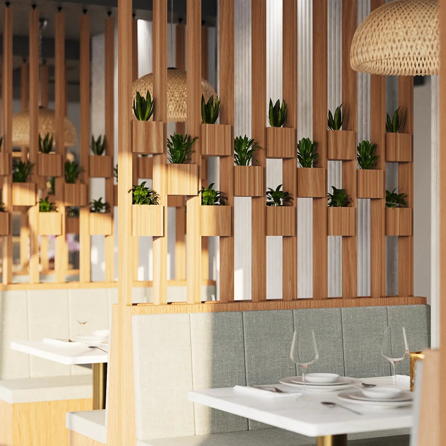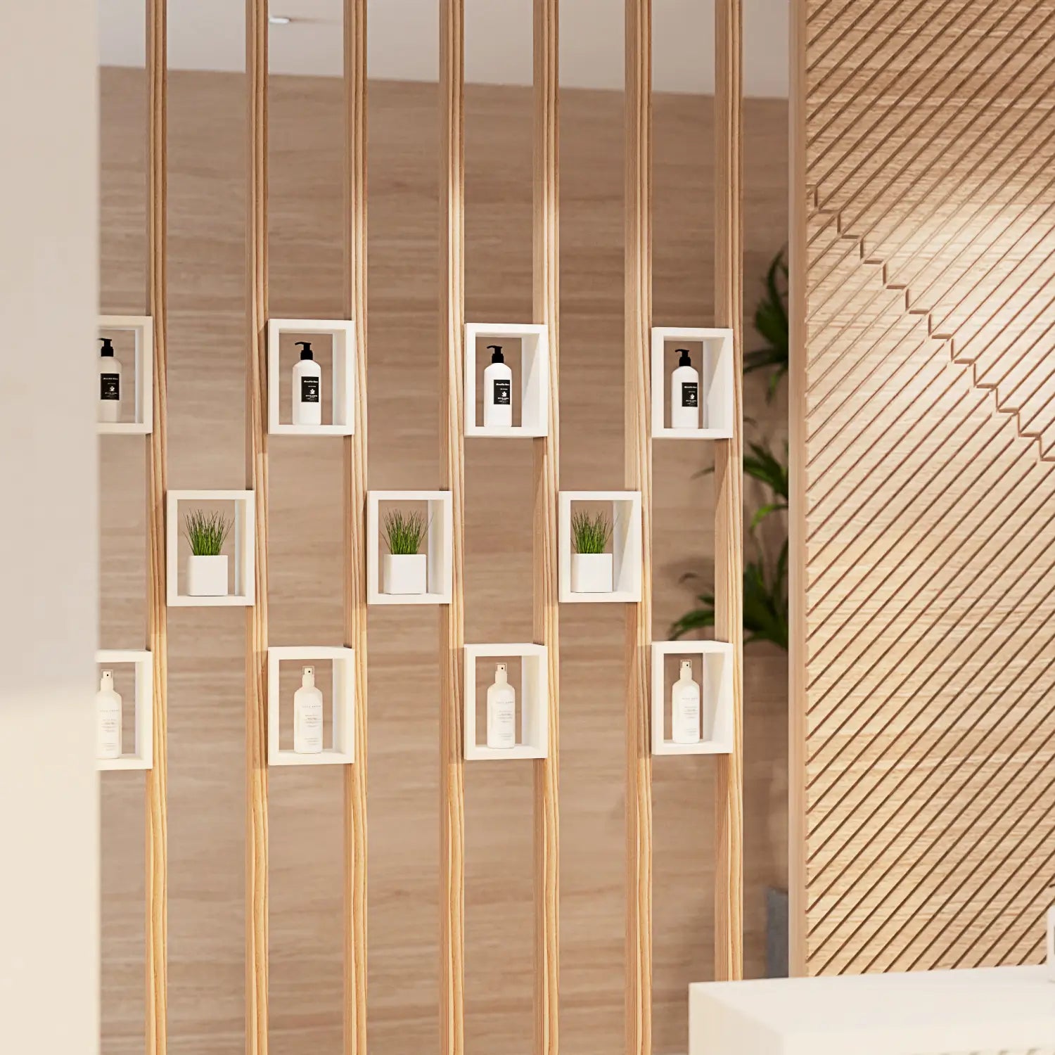 - Curved slat walls and vertical bamboo-inspired screens