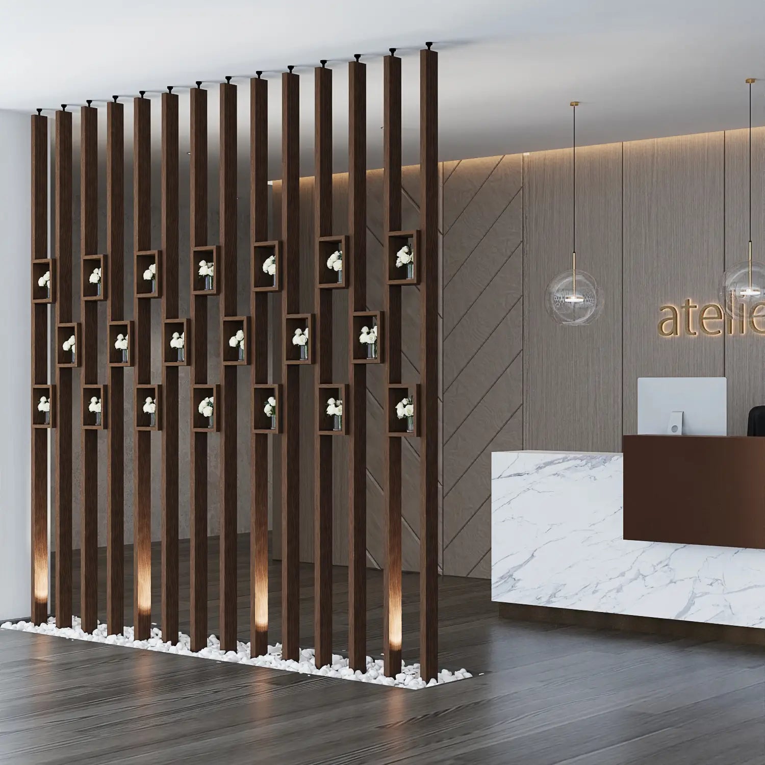 Our dividers are made-to-order—you select the exact height, width, and slat configuration. Whether you need a full floor-to-ceiling slatted partition or a smaller decorative accent screen, our system adapts seamlessly.